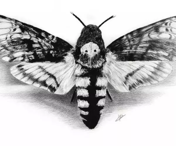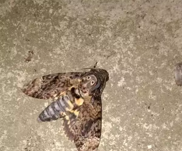 展翅宽100~125mm。翅膀颜色以杂乱的深黑褐色为主;最大特征是胸部背侧有1个骷髅头般的花纹。雌雄差异不明显。