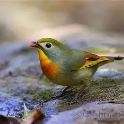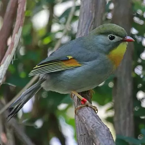 银耳相思鸟小型鸟类,体长14~18厘米。头顶黑色,耳羽银灰色,前额橙黄色;外侧飞羽橙黄色,基部朱红色,…