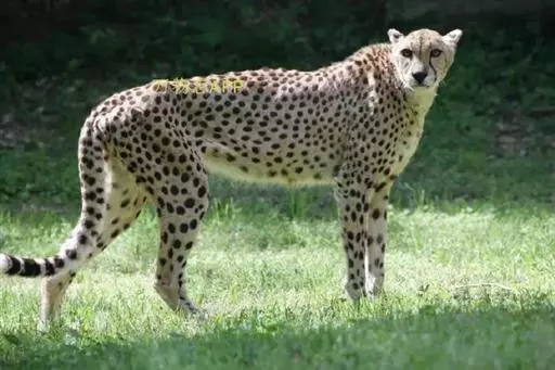 猎豹(学名:Acinonyx jubatus):又称印度豹,是猫科猎豹属的一种动物,也是猎豹属下唯一的物种。猎豹全身都有黑色的斑点。从嘴角到眼角有一道黑色的条纹,尾巴末端的三分之一部位有黑色的环纹;后颈部的毛比较长,好像很短的鬃毛一样,体型是纤细、腿长、头小。