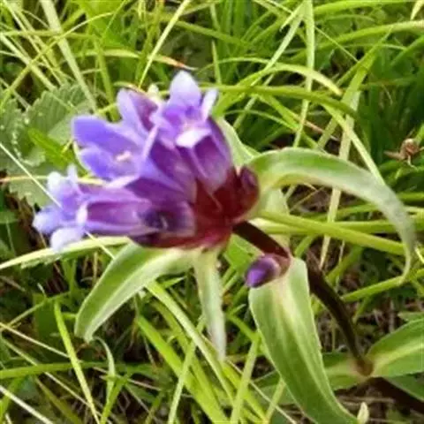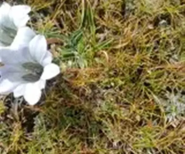 大花龙胆(Gentiana szechenyii Kanitz)多年生草本,高5-7厘米。主根粗大,圆柱形,具多数略肉质的须根。花枝数个丛生,较短,黄绿色,光滑。叶常对折,边缘白色软骨质,密被乳突,中脉白色软骨质,在两面均明显,叶柄白色膜质,光滑;莲座丛叶剑状披针形,茎生叶密集。花单生枝顶,基部包于上部叶丛中;无花梗;花萼筒白色膜质,有时上部带紫红色,倒锥状筒形,长1.2-1.7厘米,裂片稍不整齐,椭圆形。花冠筒状钟形,上部蓝色或蓝紫色,下部黄白色,裂片卵圆形。蒴果内藏,狭椭圆形,先端渐尖,基部钝,柄粗壮;种子深褐色,矩圆形,表面具浅蜂窝状网隙。花果期6-11月。