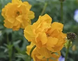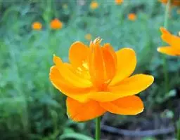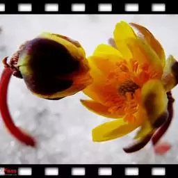 花单生茎顶端,无毛,在开花时围在茎近顶部的叶中;萼片约5,膜质,狭菱形或狭卵形,长约8毫米;花瓣约8,橙黄色,下部黑紫色,倒披针形,长约10毫米;花药宽椭圆形或近球形,长约0.8毫米;心皮多数,子房狭卵形,有1条背肋,顶部渐狭成短花柱。瘦果卵球形,长约3.5毫米,脉网隆起,有明显的背肋和腹肋。6月开花。