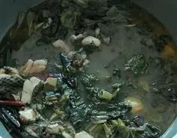 2、将鳗鱼头,骨及内脏等加入蒜,生姜,胡椒,熬成鳗鱼高汤。
