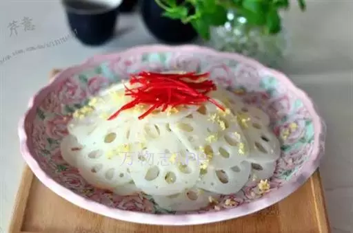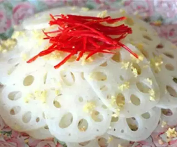 原料:鲜藕1节约300克,红椒半个,白糖50克,白醋50克,桂花,盐适量。