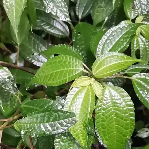 叶近膜质,在同对的不等大,以70-90角度展开,菱状椭圆形、菱状披针形或卵形,长1.5-6厘米,宽0.7-2.8厘米,先端长渐尖、尾状渐尖或锐尖,顶尖钝头,基部宽楔形或近圆形,下部的叶较小,宽卵形或近圆形,先端锐尖或钝圆,边缘全缘,上面绿色,下面淡绿色,干时呈细蜂案状,钟乳体条形,长约0.3毫米,在上面明显,基出脉3条,在上面凹陷,在下面稍隆起,其侧出的一对弧曲,在近先端消失,侧脉3-5对,不明显;叶柄纤细,长0.5-2厘米;托叶小,三角形,长约1毫米,近宿存。