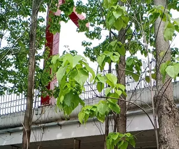 楸树栽植后前期不修剪任何枝条,以保证地上部分吸取养分的动力。10月中下旬苗木停止生长后,对树干分枝点以下萌生枝条全部修除,修除枝条时要做到不留结疤,保持树干光滑美观。楸树自然冠型秀美,自第二年起于每年秋季只对分枝点以下主干修除萌生枝条,分枝点以上不作任何修剪,保留其自然景观效果。