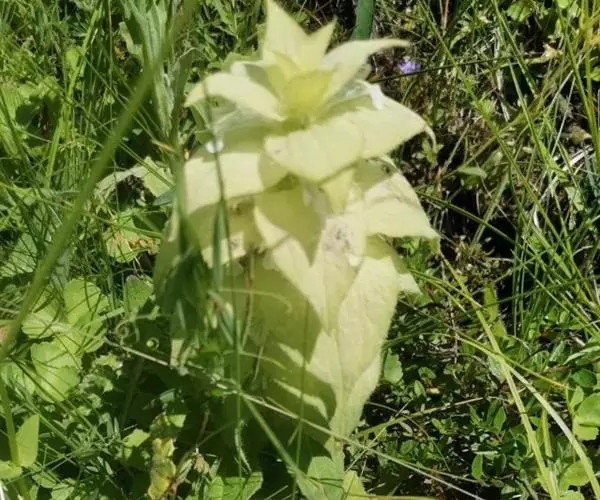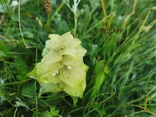 多年生草本,具地下走茎。茎粗壮,直立,高18-25厘米,四棱形,具槽,沿棱及节上被白色具节长柔毛。叶柄具狭翅,基部抱茎,边缘具缘毛;叶片纸质,披针状长圆形,长5-11厘米,宽1.8-3厘米,先端钝或稍圆,基部楔形,下延,边缘疏生波状圆齿或几全缘,具缘毛,上面无毛或被极少的疏柔毛,下面仅叶脉被长柔毛或仅近顶端有星散疏柔毛。穗状聚伞花序由多数轮伞花序组成;苞叶大,向上渐小,白黄、白或绿紫色,卵形或阔卵形,长3.5-5厘米,宽1.8-2.7厘米,先端渐尖,基部圆形,抱轴,全缘,上面被长柔毛,下面仅叶脉或有时仅顶端被疏柔毛;花梗短,被长柔毛。花萼钟状或略呈漏斗状,长7-9毫米,基部前方略膨大,具10脉,其中5脉不甚明显,萼齿5,狭三角形,长为花萼之半或较长,整齐,先端渐尖,边缘具缘毛。花冠白、白绿或白黄色,具紫色斑纹,狭漏斗状,长1.8-2.5厘米,外面被疏长柔毛,冠筒基部前方略膨大,内面具毛环,从前方向下弯,冠檐二唇形,上唇小,直立,2裂,裂片近圆形,下唇延伸,3裂,中裂片狭扇形,长约6.5毫米,顶端微缺,侧裂片长圆形,长约3毫米。雄蕊4,二强,着生于冠筒中部,伸出,花丝细,挺直,被长柔毛或疏柔毛,花药肾形,1室。花柱无毛,伸出,较雄蕊略短,先端2浅裂,裂片细尖。花盘杯状,裂片近相等,不明显,前方微膨大。子房4裂,被长柔毛。小坚果倒卵状或倒卵长圆状三棱形,背部具网状皱纹,腹部中间微微隆起,具1大果脐,而果脐几达腹面之半。花期7-9月,果期8-10月。