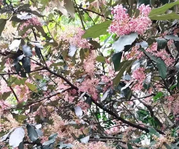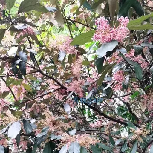 长柄银叶树(学名:Heritiera angustata pierre)就是一种海漂植物,为梧桐科银叶树属物,常绿乔木,树高达12米,叶革质,上面无毛,下面被银白色或带金黄色的鳞秕,叶柄长较长,通常有2-9厘米,因得此名。圆锥花序顶生或腋生,粉红色细小,其实它没有花瓣,我们所看到的那个粉红色的瓮是它的花萼。每到花期,长柄银叶树的花序一束一束渐次长出,一朵朵圆筒状的花苞,密密麻麻,铺天盖地的粉红装饰了整个枝条,随风轻晃,摇曳多姿。满地的落英更是让人忍不住轻哼一首早年流行的歌谣——粉红色的回忆。长柄银叶树的果实为核果状、椭圆形,密度较低,可以顺着洋流,乘着潮汐散播它们的后代。