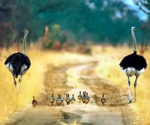 鸵鸟的祖先也是一种会飞的鸟类,它是怎么变成今天的模样,这与它的生活环境有着非常密切的关系。鸵鸟是一种原始的残存鸟类,它代表着在开阔草原和荒漠环境中动物逐渐向高大和善跑方向发展的一种进化方向。与此同时,飞行能力逐渐减弱直至丧失。非洲鸵鸟的奔跑能力是十分惊人的。它的足趾因适于奔跑而趋向减少,是世界上唯一只有两个脚趾的鸟类,而且外脚趾较小,内脚趾特别发达。它跳跃可腾空2.5米,冲刺速度在每小时70公里以上。同时粗壮的双腿还是非洲鸵鸟的主要防卫武器,甚至可以致狮,豹于死地。