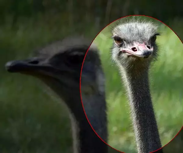 翅膀上的羽毛和别的飞行鸟类的硬翅膀有着显著的不同,它们是绝热的。在上面还有爪子。强壮的腿上是没有羽毛的,用2趾站立,大的那个就像是蹄。这是鸵鸟的独特的适应性,为了应付突来危险而快速奔跑。鸵鸟的巨大眼球,带着浓黑的眼睫毛,是陆地生物中最大的眼球,只有鲸的眼球比之更大。鸵鸟视力佳,一个眼球重达60公克,可看清3至5公里远的东西,其瞬膜(第3眼睑)有阻挡沙砾及保护眼睛之功能。