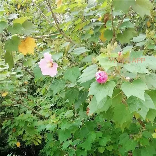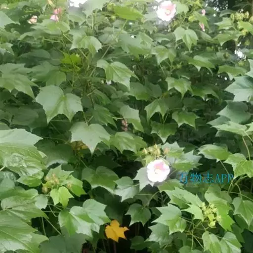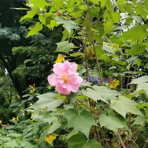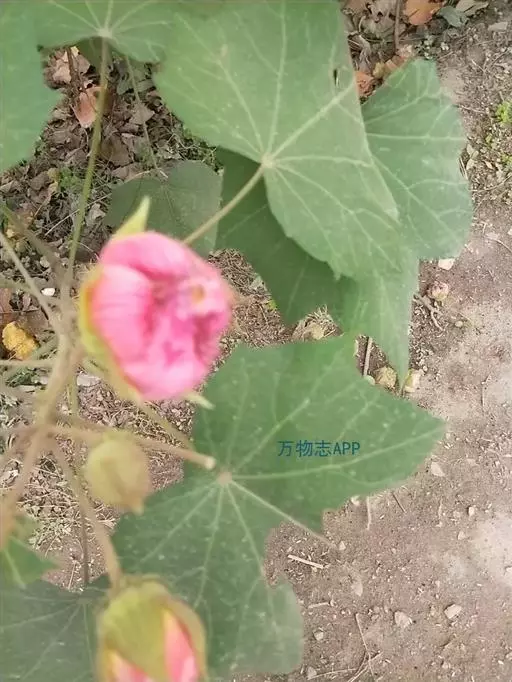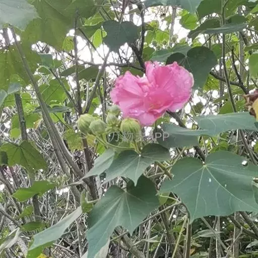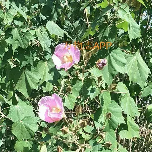 木芙蓉 木芙蓉(原变型)为落叶灌木或小乔木,高2-5米;小枝、叶柄、花梗和花萼均密被星状毛与直毛相混的细绵毛。叶宽卵形至圆卵形或心形,直径10-15厘米,常5-7裂,裂片三角形,先端渐尖,具钝圆锯齿,上面疏被星状细毛和点,下面密被星状细绒毛;主脉7-11条;叶柄长5-20厘米;托叶披针形,长5-8毫米,常早落。