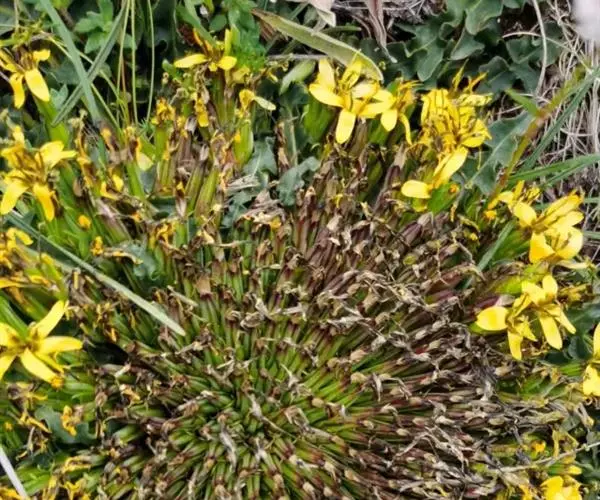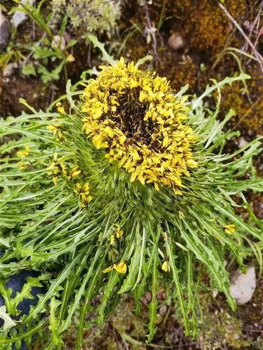 多年生草本。根长,垂直直伸,倒圆锥状。茎极短或几无茎,高1-8厘米。叶稠密,集中排列在团伞花序下部,线形或长椭圆形,长1-2厘米,宽1-4毫米,皱波状羽状浅裂或深裂,叶柄宽扁,长达1厘米,叶柄与叶片被稀疏或稠密的长硬毛,极少无毛。头状花序多数在茎端排成团伞状花序,团伞花序直径2-9厘米,花序梗长5毫米。总苞狭圆柱状,直径2毫米;总苞片2层,外层2枚,线形,紧靠内层,长6-12毫米,被稀疏的长或短硬毛;内层总苞片4枚,近等长,长椭圆形,长约7毫米,宽约1.5毫米,顶端钝或圆形,外面有稀疏长柔毛或无毛。舌状小花黄色,4枚。瘦果长倒圆锥状,微压扁,下部收窄,顶端截形,长2.5毫米,有17条粗细不等的纵肋。冠毛鼠灰色或浅黄色,长约8毫米,细锯齿状。花果期7-8月。