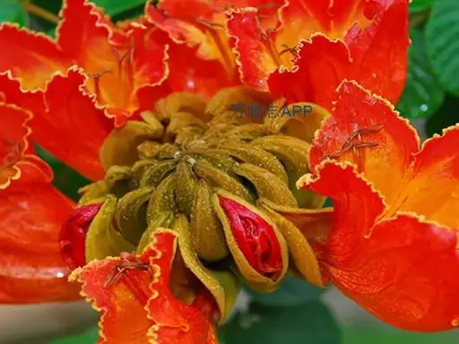 花大,聚成紧密的伞房式总状花序;花萼佛焰苞状,长5-10厘米;花冠钟状,一侧膨大,长3-5厘米,直径5-6厘米,橙红色,中心黄色,有纵皱。蒴果长圆状棱形,果瓣赤褐色,近木质。种子有膜质翅。花生于枝叶顶端,花冠呈钟形,花瓣为红色或者橙红色,单花长月10厘米,花聚成紧密的伞房式总状花序,看上去就好像是一团燃烧着的火焰。