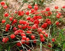 雌雄异株,核果,被有白粉,核果下有一肉质肥大的果托。种托大于种子,且成熟种托呈红色,加上先端的绿色种子(形似披裟合手罗汉)。种子球形,易发芽。