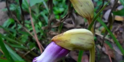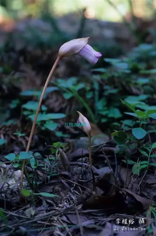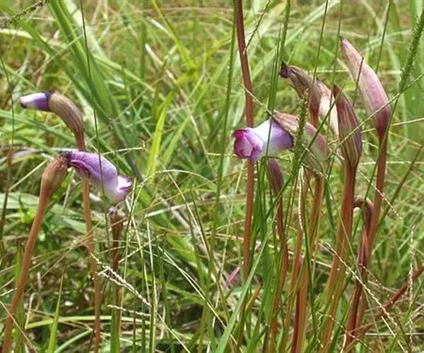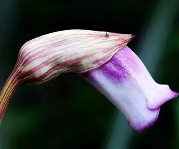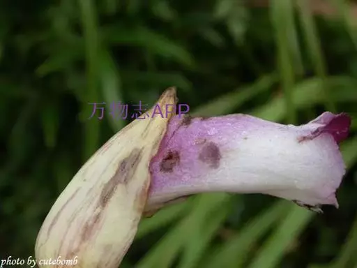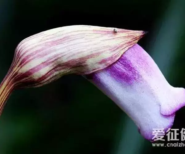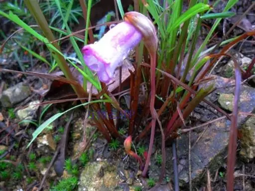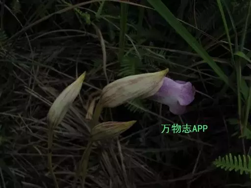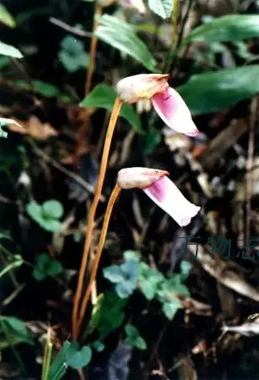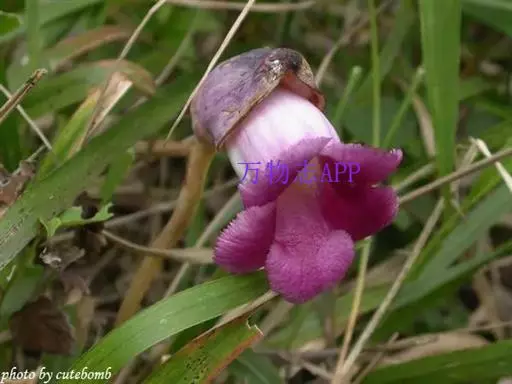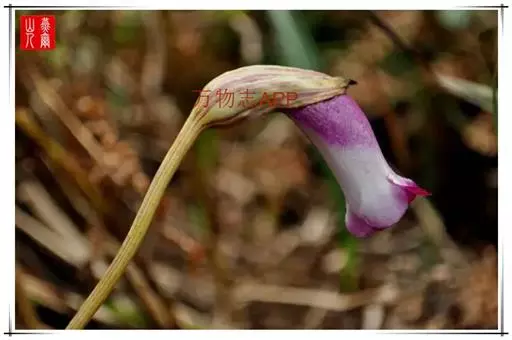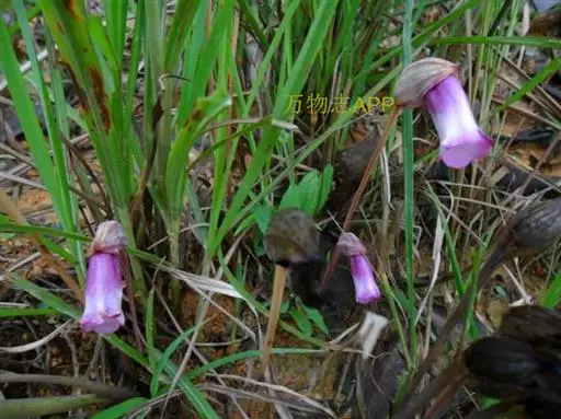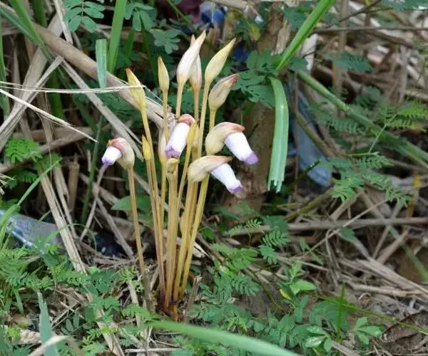 一年生寄生草本,高15-40(-50)cm。根稍肉质,具树状细小分枝。茎黄褐色或紫红色,不分枝或自近基部处有分枝,偶尔自中部以上分枝。叶肉红色,卵状披针形或披针形,长5-10mm,宽3-4mm,两面光滑无毛。花常单生茎端,稍俯垂。花梗粗壮,常直立,长10-30(-40)cm,直径约3mm,无毛,常具紫红色的条纹。花萼一侧裂开至近基部,长2.5-4.5(-6.5)cm,紫红色、黄色或黄白色,具紫红色条纹,先端急尖或渐尖,两面无毛。花冠带粘液,常与花萼同色,或有时下部白色,上部带紫色,凋谢后变绿黑色,干时变黑色,长4-6cm,不明显的二唇形,筒部宽,稍弯曲,在花丝着生处变窄,顶端5浅裂,上唇裂片和下唇的侧裂片较短,近圆形,全缘,下唇中间裂片稍大。雄蕊4枚,内藏,花丝着生于距筒基部1.4-1.5cm处,长7-9mm,紫色,无毛,花药黄色,有粘液,成对粘合,仅1室发育,下方一对雄蕊的药隔基部延长成距。子房1室,侧膜胎座4个,横切面有极多分枝,花柱无毛,长1-1.5cm,柱头膨大,肉质,淡黄色,盾状。蒴果圆锥状或长卵球形,长约2-3cm,2瓣开裂。种子多数,细小,椭圆形,黄色,长约0.04mm,种皮网状。花期4-8月,果期8-10月。