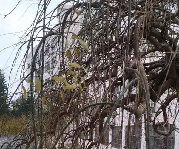 树皮暗灰色,粗糙,不规则纵裂。幼树枝条直立,且被白色毛;老树枝条先端下垂,有时木栓质发达成为瘤状。…