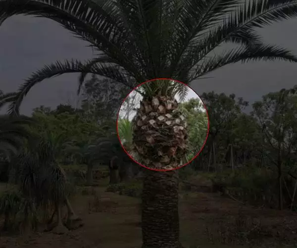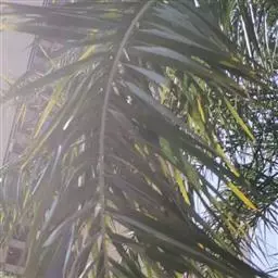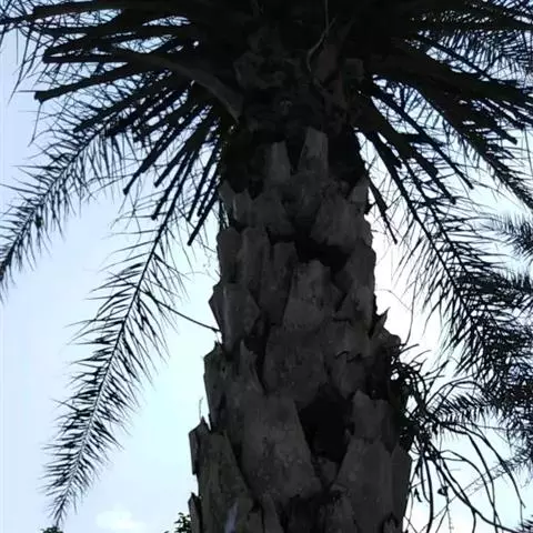 加那利海枣单干直立,自然高度可达18米,干径50-90厘米,幼时被以枯叶,老树则叶柄基部残存。具波状叶痕,羽状复叶,顶生丛出,向四方开张,形成大圆形树冠,长可达5-6米,略弯呈弧形;羽片数可达400个,绿色;小叶狭条形,长100厘米左右,宽2-3厘米,近基部小叶坚韧,变成针刺状。叶柄短,基部肥厚成为多数黄褐色叶鞘网包被树干。