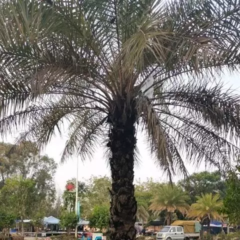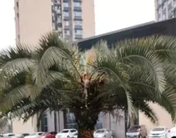 加那利海枣(学名:Phoenix canariensis Chabaud)是棕榈科刺葵属植物,因产于非洲的加那利群岛而得名。单干直立,自然高度可达18米,干径50-90厘米,幼时被以枯叶,老树则叶柄基部残存。具波状叶痕,羽状复叶,顶生丛出。雌雄异株,肉穗花序自叶间抽出,长可达2米。浆果,果实卵状球形至长椭圆形,先端微突。种子椭圆形,中央具深沟、灰褐色。每年3-4月问抽生花序,5月上旬开花,花小,9-10月间果实成熟,自然结实率低。 [1-2]