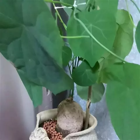 木质大藤本,长可达10余米或更长,茎褐色,具深沟状裂纹,小枝和叶柄具直纹。叶革质,长圆状卵形,有时阔卵形或阔卵状近圆形,长约10-25厘米,宽约2.5-9厘米,顶端近骤尖或短渐尖,基部圆或钝,有时近心形或楔形,两面无毛;掌状脉3-5条,中脉每边通常有3条侧脉,连同网脉均在下面凸起;叶柄长5-14厘米,呈不明显盾状着生。
