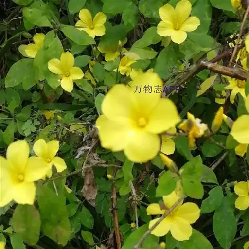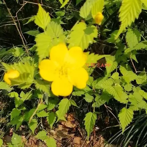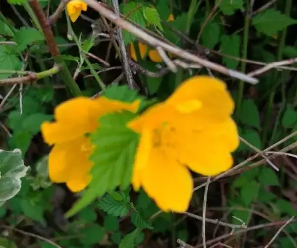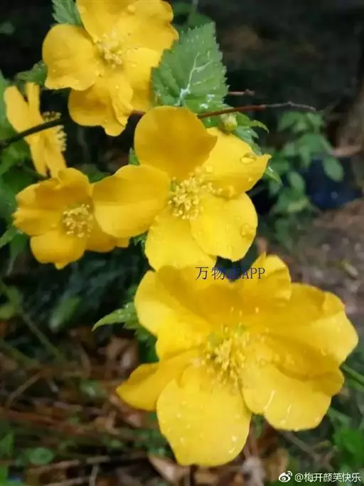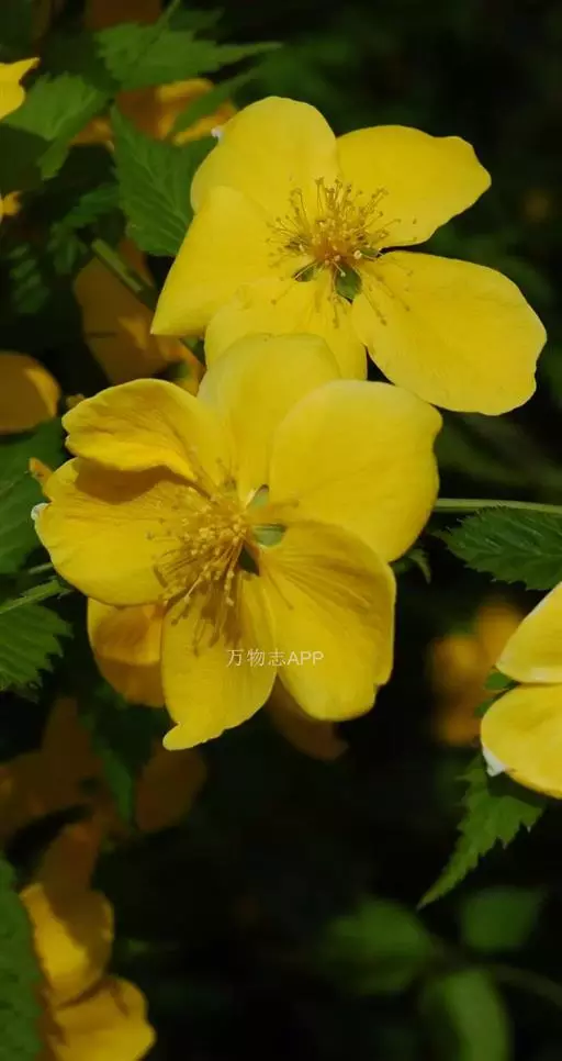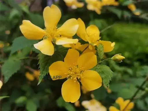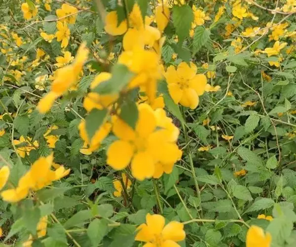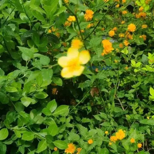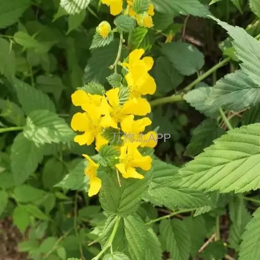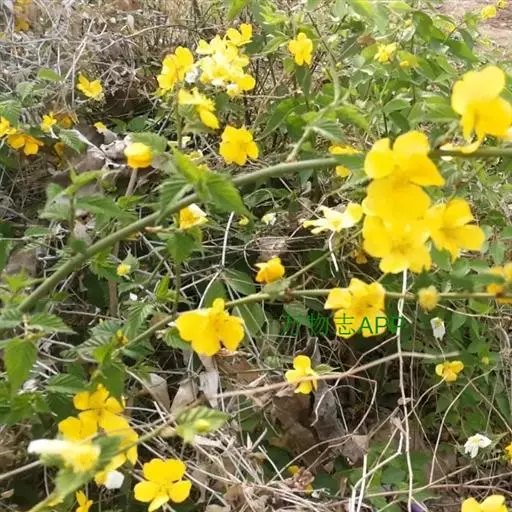 棣棠花(学名:Kerria japonica (L.) DC.):灌木,高1-2米;小枝有棱,绿色,无毛。叶卵形或三角形,先端渐尖,基部截形或近圆形,边缘有重锯齿,上面无毛或有稀疏短柔毛,下面微生短柔毛;叶柄无毛;有托叶。花单生于侧枝顶端;无毛;花直么3-5厘米;萼筒扁平,裂片5,卵形,全缘,无毛;花瓣黄色,宽椭圆形;雄蕊多数,离生,长约花瓣之半;心皮5-8,有柔毛,花柱约与雄蕊等到长。瘦查黑色,无毛,萼裂片宿存。