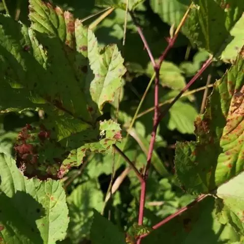 发病症状:发病初期叶片边缘着生有灰褐色病斑,病斑呈不规则状扩展,内灰褐色,边缘红褐色,发病后期病斑干枯,褐色,着生黑色粒状物。