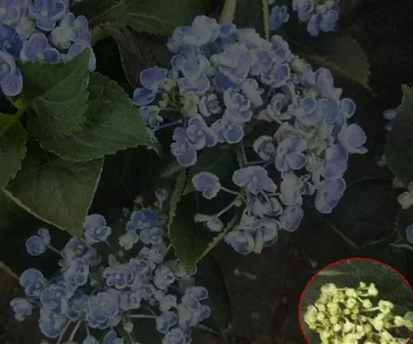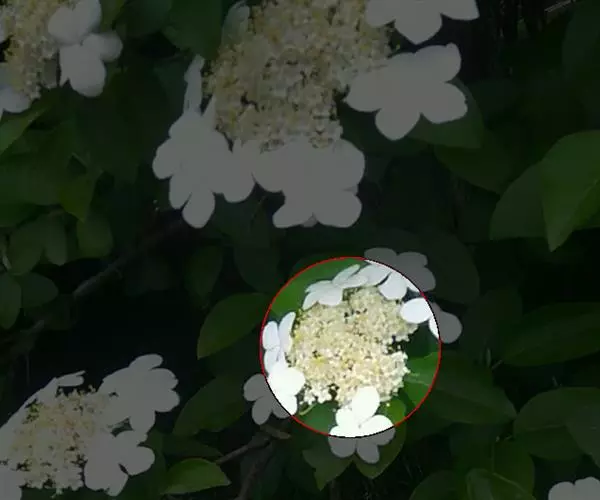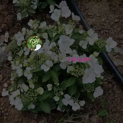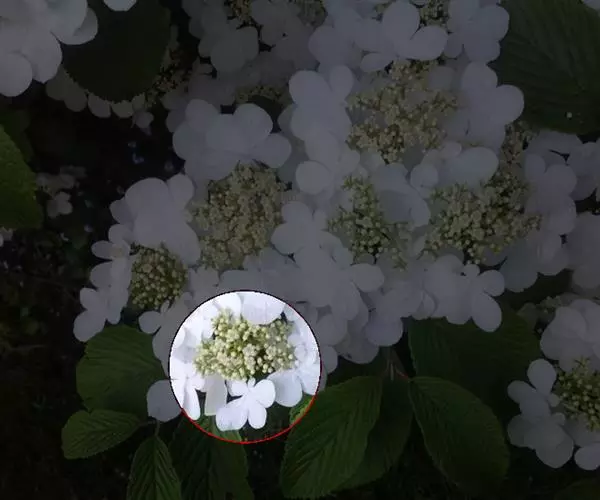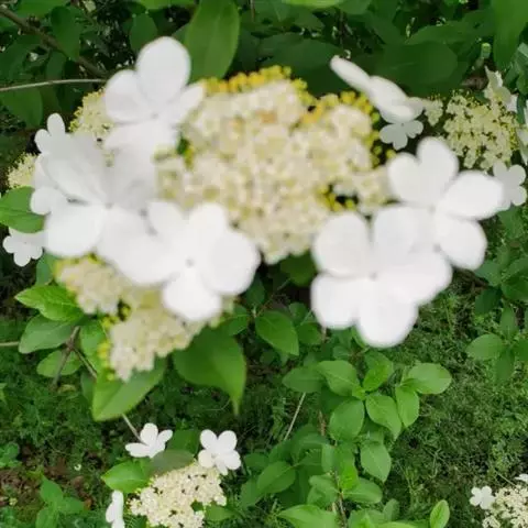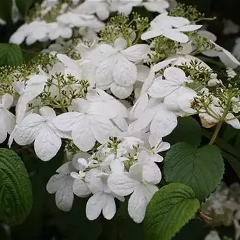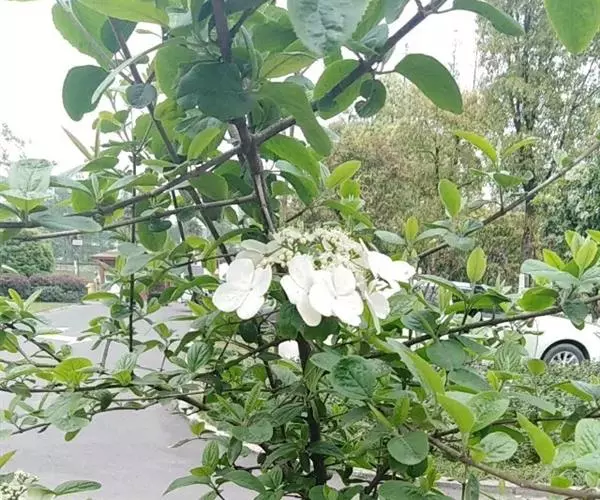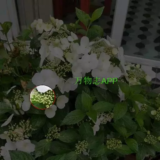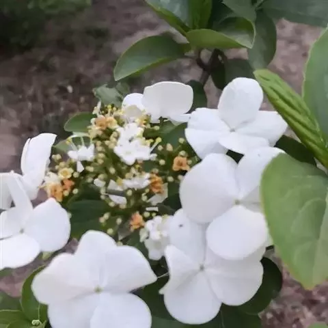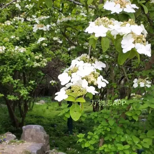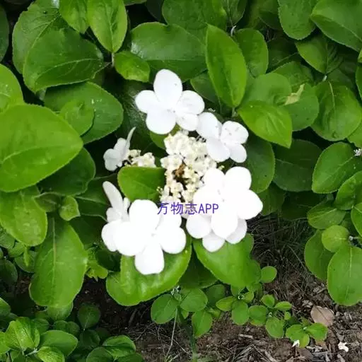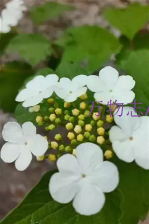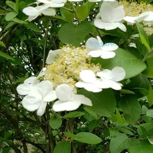 聚伞花序直径8-15厘米,全部由大型不孕花组成,总花梗长1-2厘米,第一级辐射枝5条,花生于第三级辐射枝上;萼筒筒状,长约2.5毫米,宽约1毫米,无毛,萼齿与萼筒几等长,矩圆形,顶钝;花冠白色,辐状,直径1.5-4厘米,裂片圆状倒卵形,筒部甚短;雄蕊长约3毫米,花药小,近圆形;雌蕊不育。花期4-5月。