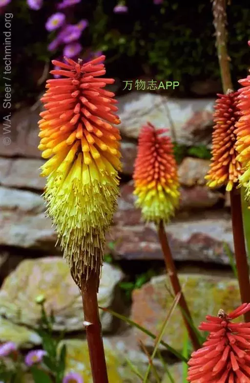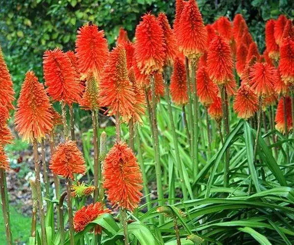 花茎通常高100-140厘米,矮生品种在40-60厘米左右,为密穗状总状花序,花序长20-30厘米,由百余朵小花组成。小花数可多达300朵以上。小花自下而上逐渐开放,一个花序的开花时期约有20天左右。早春生长强健的单株,花茎下部的侧芽会在花后又萌发开花。在根茎群上第1批花开后,一些后发的单株也会再开1批花。这种在整个火炬花群体中分2-3次连续开花的现象,使夏初火炬花的观赏期可延长到30-40天。秋后萌发的一些侧芽,也有一部分在9-10月会抽出花茎,形成秋花。