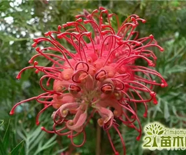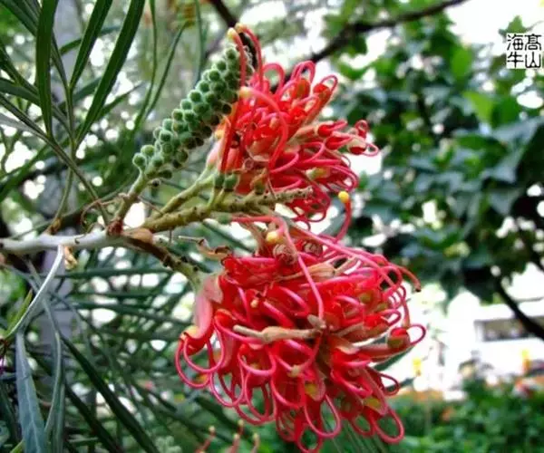 常绿乔木,树高4-8米,胸径达15-18厘米。树干端直,树冠圆锥形,树皮黑褐色,呈不规则的浅纵裂,幼枝、嫩芽及叶柄上密被锈褐色或灰褐色粗毛,单叶互生,二回羽状深裂,裂片5-12对,近披针形,叶面深绿色,中脉下陷,叶背被褐色绒毛与银灰色绢毛,总状花序,花两性,似大型的毛刷生于枝顶,花冠呈简状,雄蕊花柱伸出花冠筒外,先端弯曲,花亮红,密集。