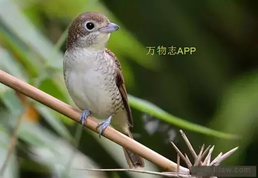 虎纹伯劳(学名:Lanius tigrinus):全长165毫米左右。雄性成鸟:额基、眼先和宽阔的贯眼纹黑色;前额、头顶至后颈蓝灰色;上体余部包括肩羽及翅上覆羽栗红褐色,杂以黑色波状横斑;飞羽暗褐色,外翻具棕褐色羽缘;尾羽棕褐色,具不明显的褐色横斑,外侧尾羽端缘棕白色;下体纯白色,两胁略沾蓝灰色;覆腿羽白杂以黑斑。雌性成鸟羽色与雄鸟相似,但前额基部黑色较小,眼先及过眼黑纹沾褐,头顶灰色及背羽的栗褐色均不如雄鸟鲜艳;胁部缀以黑褐色鳞状横斑。