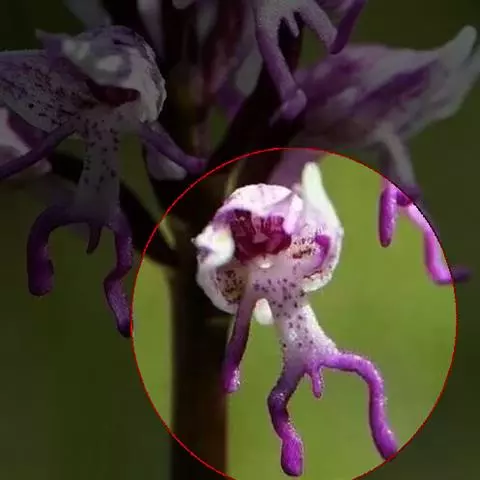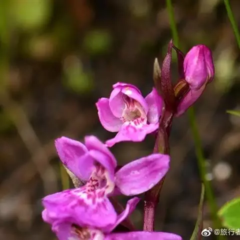 植株高6-10厘米。块茎小,卵球形或圆球形,长约5毫米,肉质。茎纤细,直立或近直立,基部具1-2枚筒状鞘,下部光滑,在近基部至中部具1枚叶,顶生1朵花。叶片披针形、倒披针状匙形或狭长圆形,长2-3厘米,宽6-10毫米,先端急尖或钝,基部收狭成抱茎的鞘。花苞片线状披针形,先端急尖,较子房长,但短于花;子房纺锤形,扭转,无毛,连花梗长6-11毫米;花中等大,淡紫色,粉红色或白色,具紫色斑点;萼片先端钝,具1脉,中萼片直立,凹陷呈舟状,狭卵形,长4毫米,下部宽1.6毫米;侧萼片狭长圆状椭圆形,长约5毫米,宽约1.6毫米;花瓣直立,斜卵形,与中萼片等长而较宽,并与中萼片相靠合,具1脉;唇瓣向前伸展,张开,内面被短柔毛,长、宽均约8毫米,近基部收狭成短爪,基部具距,中部之下3裂,侧裂片楔状长圆形,先端截形或钝,边缘全缘或微波状,中裂片倒卵形,较侧裂片宽多,先端凹缺呈2浅裂,边缘全缘或微波状;距圆筒状,下垂,长3-4毫米,末端钝,长为子房的1/3或1/2;蕊柱短,直立;花药近球形,直立,药室基部靠近,顶部叉开;花粉团近球形,具花粉团柄和粘盘,粘盘卵形;蕊喙小,三角形,直立;柱头2个,隆起,近四方形;退化雄蕊2个,小,圆形。花期7-8月。