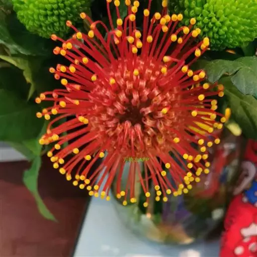针垫花,形如其名,花朵盛开时像大头针插在球形的针垫上,非常少见,十分美丽。颜色鲜艳夺目,五色缤纷,很是招人喜爱,常见的颜色有红色、黄色、橙色等。其实我们所见到的拳头般大小花球是由无数个小花朵组成的,那伸出的“针头”正是一个个舞动的花蕊。据了解,在南非针垫花开的季节还有一个非常吸引人的景色,那就是无数个围绕在花丛中的小鸟。针垫花不能自花授粉,必须以丰富的花蜜吸引了各种各样的昆虫,而这些昆虫必须穿越密布的“针林”才能享受到甜美的花蜜,而昆虫正是小鸟们猎食的对象。正是这样,针垫花不仅吸引了观花者,同时也吸引了众多观鸟者。