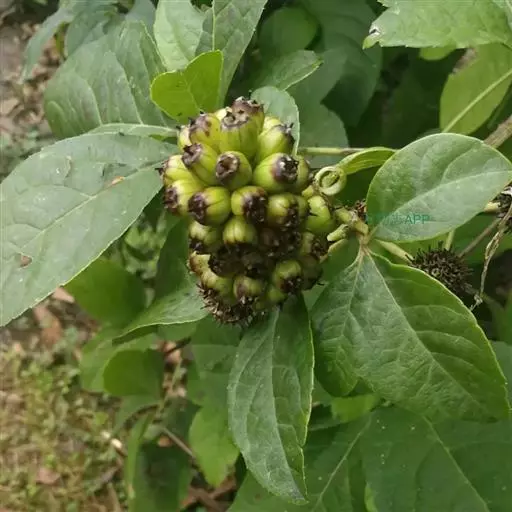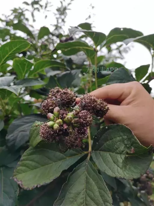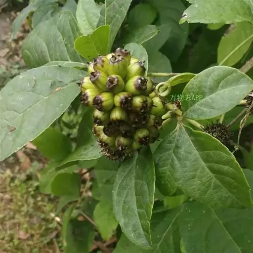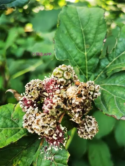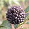 头状花序紧密,球形,直径2-3.5厘米,有花多数,5-6个稀多至10个组成顶生圆锥花序或复伞形花序;总花梗长0.5-3厘米,密生短柔毛;花无梗;萼密生白色绒毛,边缘有5小齿;花瓣5,卵形,浓紫色,长1.5-2毫米,外面有短柔毛,后毛脱落;子房2室,花柱全部合生成柱状,柱头离生。果实倒卵状椭圆球形,黑色,长1-1.5厘米,稍有棱,宿存花柱长达3毫米。花期8-9月,果期9-10月。