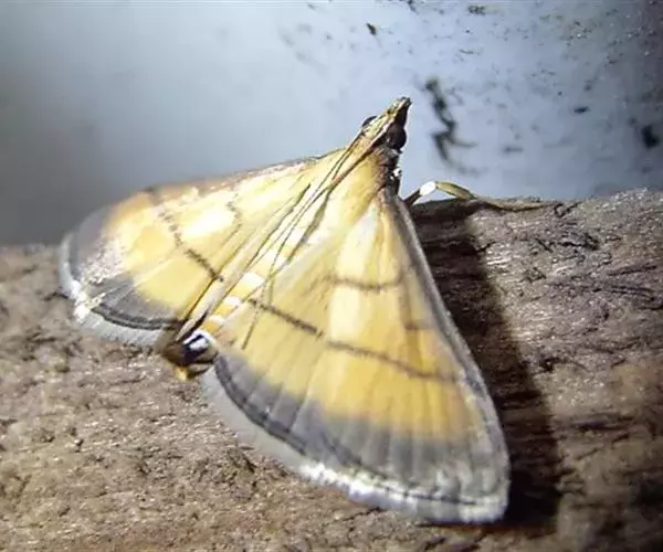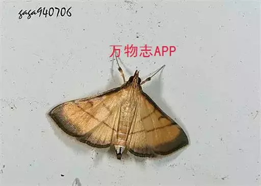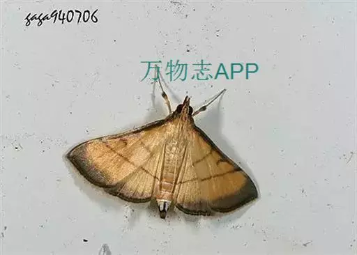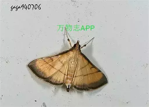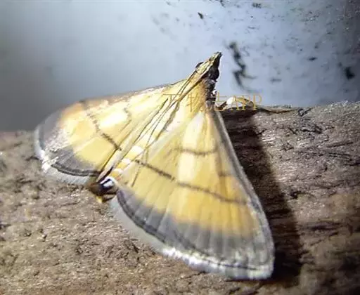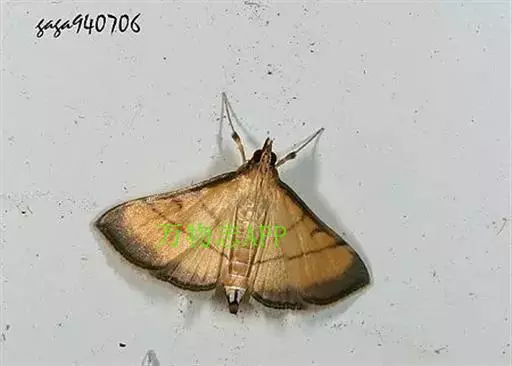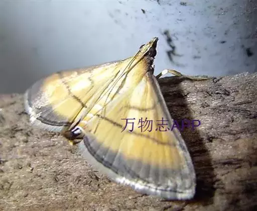 稻纵卷叶螟成虫图 成虫 成虫体长7~9毫米,翅展12~18毫米。体、翅黄褐色,停息时两翅斜展在背部两侧。复眼黑色,触角丝状,黄白色。前翅近三角形,前缘暗褐色,翅面上有内、中、外三条暗褐色横线,内、外横线从翅的前缘延至后缘,中横线短而略粗,外缘有一条暗褐色宽带,外缘线黑褐色。后翅有内、外横线二条,内横线短,不达后缘,外横线及外缘宽带与前翅相同,直达后缘。腹部各节后缘有暗褐色及白色横线各一条,腹部末节有二个并列的白色直条斑。雄蛾前翅前缘中部稍内方,有一中间凹陷周围黑色毛簇的闪光“眼点·,中横线与鼻眼点,相连;前足跗节膨大,上有褐色丛毛,停息时尾节常向上翘起。雌蛾前翅前缘中间,即中横线处无。眼点",前足咐节上无丛毛,停息时,尾部较平直。
