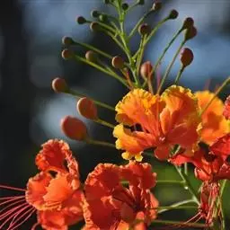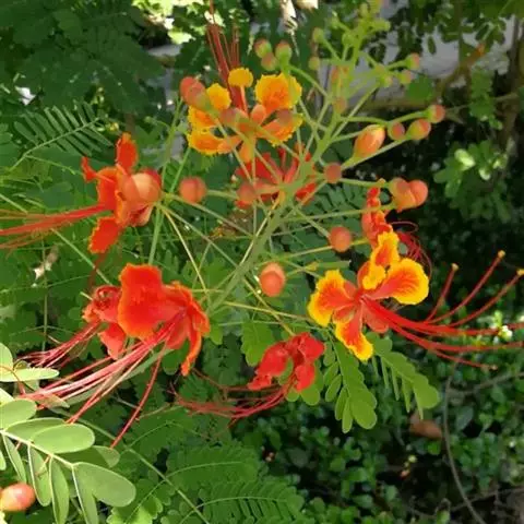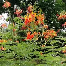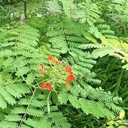 洋金凤 Sw.),豆科小凤花属灌木状或小乔木植物,枝无毛,绿或粉绿色;二回羽状复叶;总状花序伞房状,…