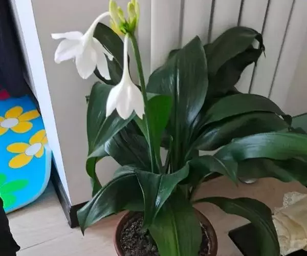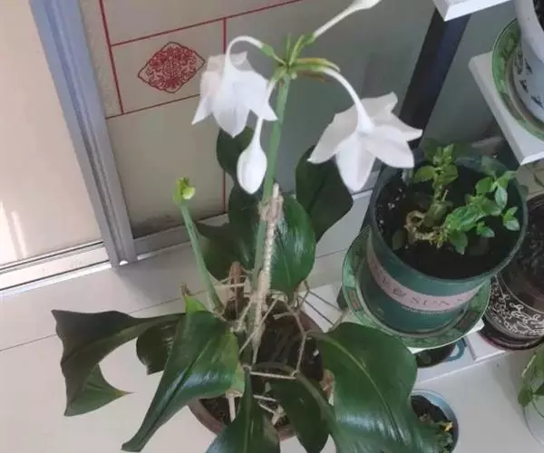 南美水仙是一种多年生鳞茎花卉,叶片肥大嫩绿,花白色,是室内盆栽观赏植物。