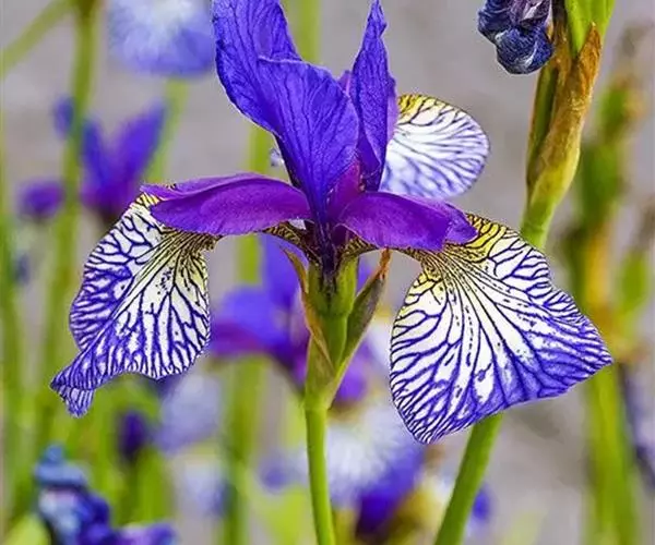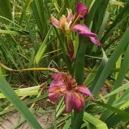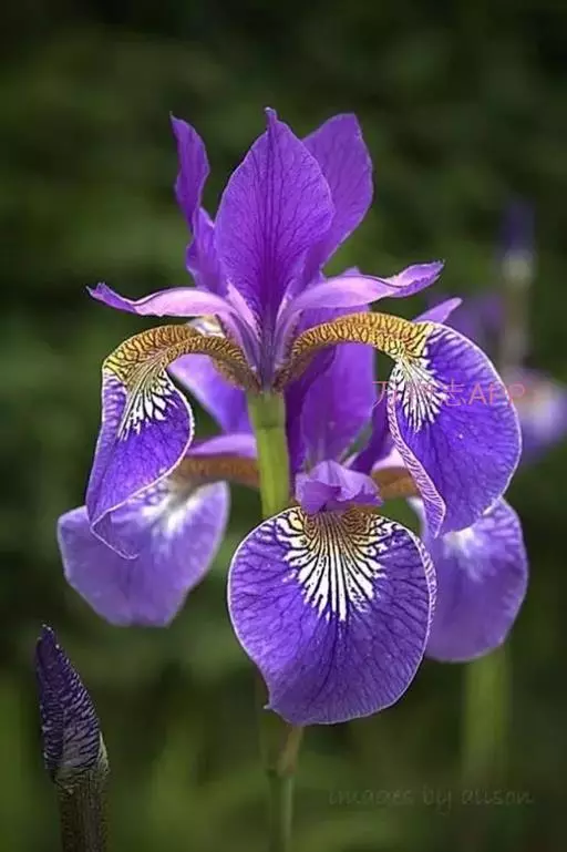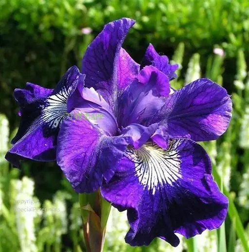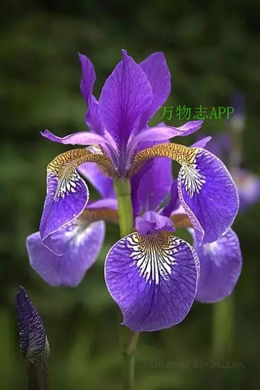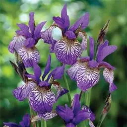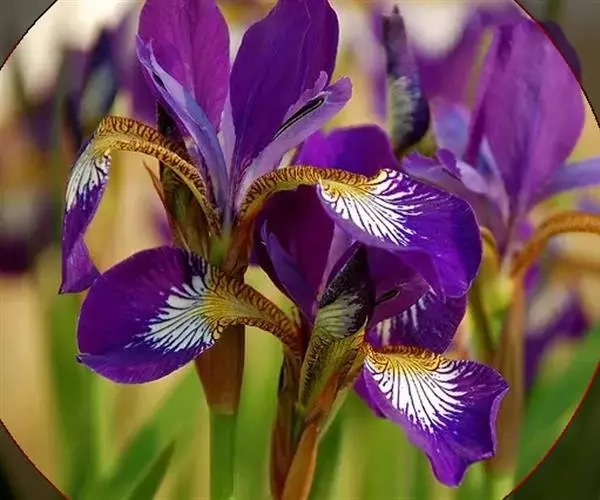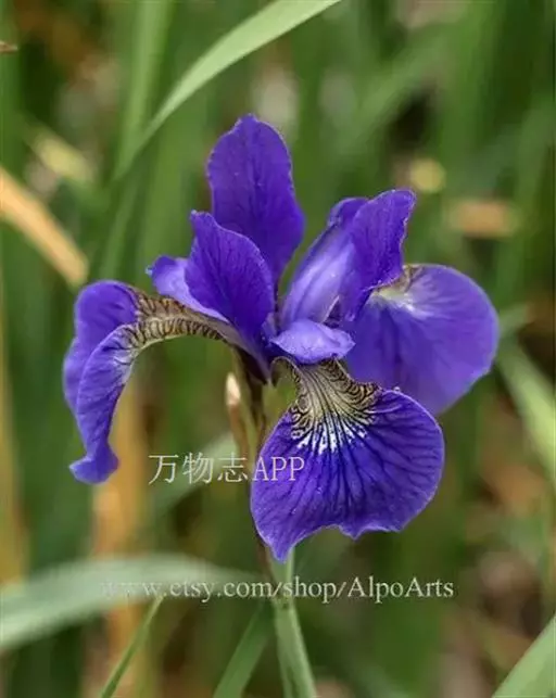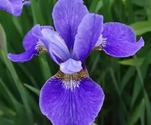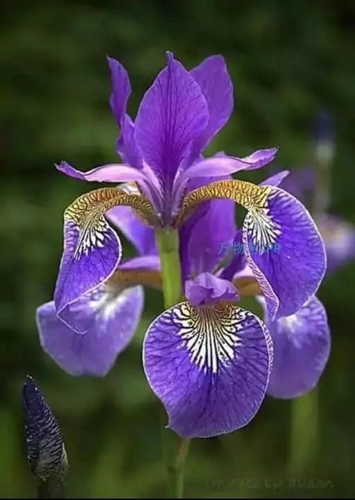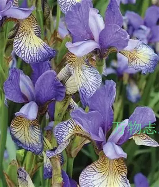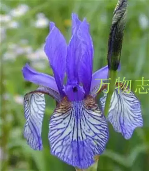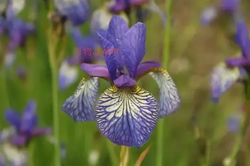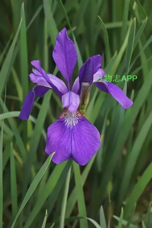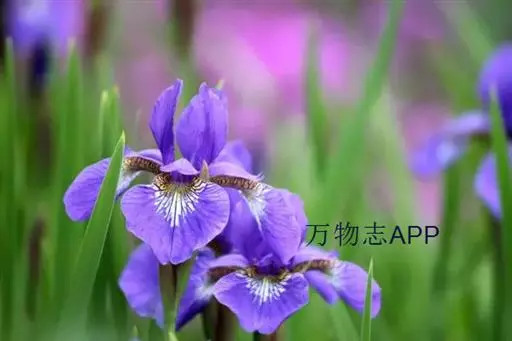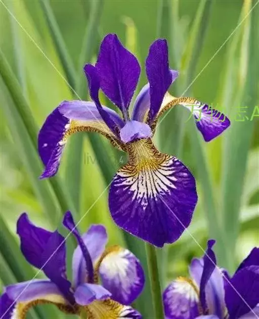 西伯利亚鸢尾(学名:Iris sibirica L.):多年生草本植物,植株基部围有鞘状叶及老叶残留的纤维。根状茎粗壮,斜伸;须根黄白色,绳索状,有皱缩的横纹。叶灰绿色,条形,顶端渐尖。花茎高于叶片,平滑,高40-60厘米,有1-2枚茎生叶;苞片3枚,膜质,绿色,边缘略带红紫色,狭卵形或披针形,顶端短渐尖,内包含有2朵花。花蓝紫色;外花被裂片倒卵形,上部反折下垂,内花被裂片狭椭圆形或倒披针形,直立。蒴果卵状圆柱形、长圆柱形或椭圆状柱形,无喙。花期4-5月,果期6-7月。