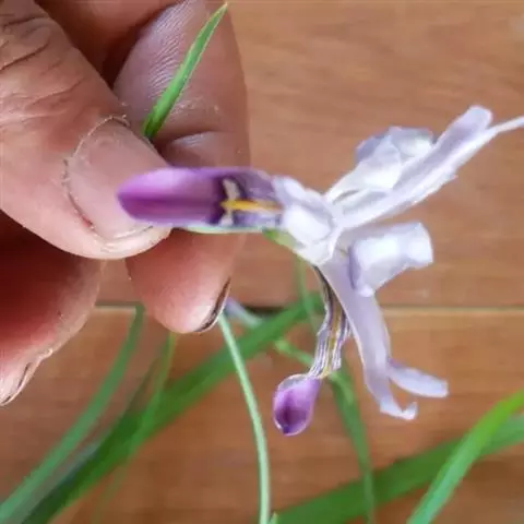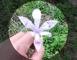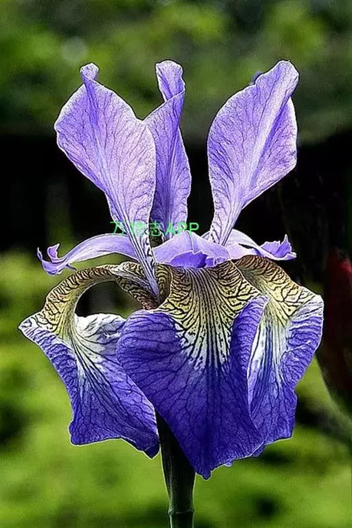 花茎高于叶片,平滑,高40-60厘米,有1-2枚茎生叶;苞片3枚,膜质,绿色,边缘略带红紫色,狭卵形或披针形,长4-5.5厘米,宽0.8-2厘米,顶端短渐尖,内包含有2朵花;花蓝紫色,直径7.5-9厘米;花梗甚短;花被管长约1厘米,外花被裂片倒卵形,长5.5-7厘米,宽3.3-5厘米,上部反折下垂,爪部宽楔形,中央下陷呈沟状,有褐色网纹及黄色斑纹,无附属物,内花被裂片狭椭圆形或倒披针形,长4.5-5.5厘米,宽1.5-1.8厘米,直立;雄蕊长3-3.5厘米,花药紫色,花丝淡紫色;花柱分枝淡蓝色,拱形弯曲,长4-4.5 厘米,顶端裂片近于半圆形,边缘有不规则的稀疏牙齿,子房绿色,纺锤形,长1.5-2厘米。