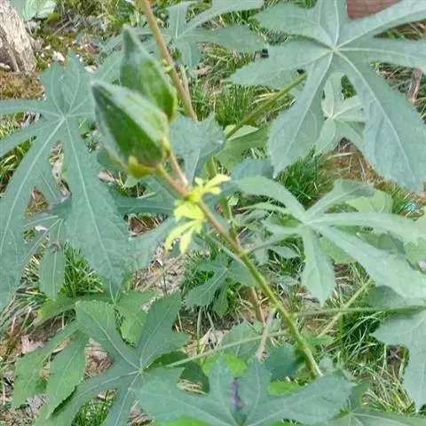 咖啡黄葵(学名:Abelmoschus esculentus (Linn.)Moench)亦称黄秋葵,锦葵科一年生草本植物。茎圆柱形,疏生散刺。叶掌状,裂片阔至狭,托叶线形,被疏硬毛。花单生于叶腋间,花梗疏被糙硬毛,小苞片钟形;花萼钟形,密被星状短绒毛;花黄色,内面基部紫色,蒴果筒状尖塔形,种子球形,具毛脉纹。花期5-9月。
