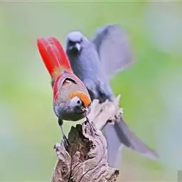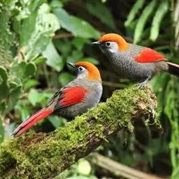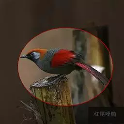 赤尾噪鹛中型鸟类,体长24~28厘米。头顶至后颈红棕色,两翅和尾鲜红色,眼先、眉纹、颊、颏和喉黑色,…