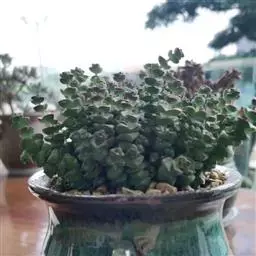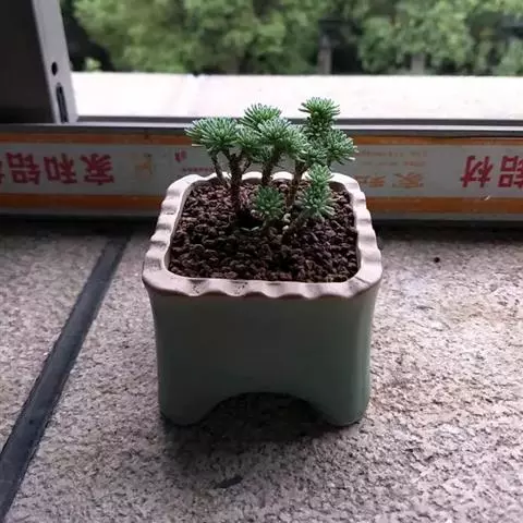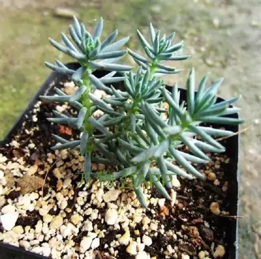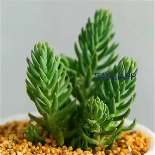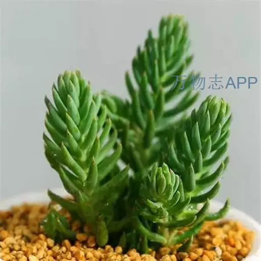 多年生草本植物株,叶尖尖的,型似“棒子”,生有气根,叶带有白色蜡粉,是灰蓝的,有种朦胧之美,叶在小枝上的排列似云杉,分叉多。像球松(小松绿)一样是直立的小型多肉植物,但没有球松健壮,两者同属同科。非常适合做庭院的地被。多年生草本,常年蓝绿色,非常的好养,植株叶片交互环生,容易长小侧芽,能够长成大串的一群,时间长了有枝干,枝干无法支撑强大的枝条基本会匍匐生长,簇状花序,花开黄色,异花授粉。