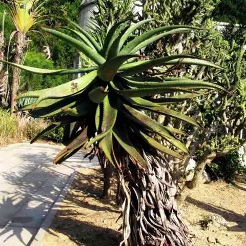 开普芦荟成株高度可达2-3米,通常不分枝。老叶枯萎后不会脱落,而是堆积在茎干上。幼株的叶刺相比成株更为显著。原产地植株生长在海拔1000米以上的多石山坡上。