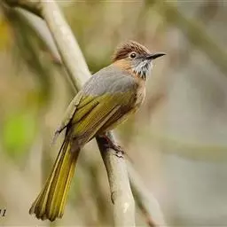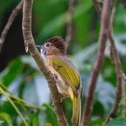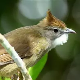 白喉冠鹎:体长20-25厘米。头顶红褐色,有长而细的羽冠、红褐色,头侧灰色。上体橄榄绿黄色,…