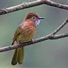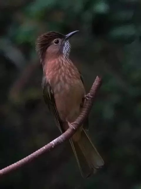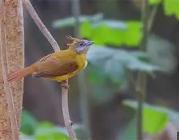 黄腹冠鹎:体长19-24厘米,是一种体型略大的褐色鹎。头顶橄榄褐色具黑褐色羽冠。白色的喉膨起,…