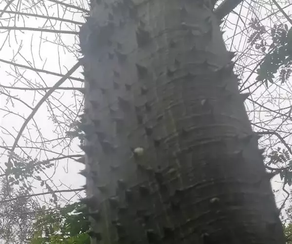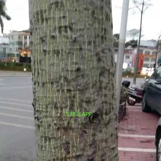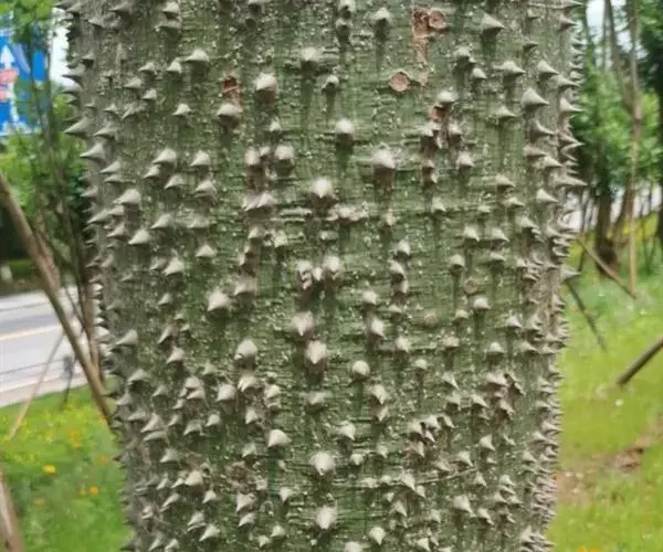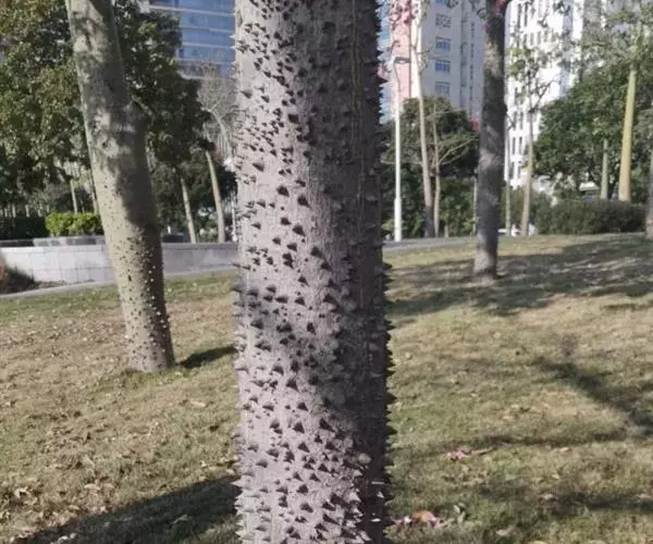 落叶乔木,高12-18米。树干挺拔,树皮绿色或绿褐色,光滑,韧皮纤维发达,具圆锥状尖刺(罕见无刺的),成年树下部膨大呈酒瓶状;大枝轮生,水平伸展或斜举,树冠伞形。
