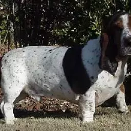 头部轮廓鲜明,既不太轻,又不太沉重,个身躯呈恰当的比例。眼睛:中等大小,充满了智慧和表情,非常欢快,但也放射出活力,既不突出,也不凹陷。眼睛的形状为杏仁形,不圆。首选的颜色是深褐色。浅黄色眼睛不理想,且处于缺陷。眼睛距离太接近属于缺陷。青灰色眼睛或眼睛内有色环属于失格。耳朵:宽且位置相当高,平躺着,决不是挂在头上。它们的位置应该比眼睛的水平高一些,耳朵向前平躺时,没有受到任何力量的拉扯,自然的延伸到嘴角。如果是重一些的狗,耳朵也相应长一些。耳朵过分长或过分厚重属于缺陷。脑袋:适度宽阔,侧面略拱,而顶部略微圆。不象指示犬(波音达犬),前额上,两眼睛之间的中心线不深,后枕骨也不显著。前脸从鼻镜向前额方向逐渐上升。这种上升在雄性身上,比在雌性身上更明显和突出。颌部结实有力且肌肉非常发达。向前额方向逐渐上升的线条上,没有象指示犬那样清晰的止部,但从侧面观察,有止部的效果,主要是由于眉毛造成的。口吻:十分长,使他能够逮住猎物,并能长时间控制它。象指示犬那样的口吻不合要求。深度是与长度呈正确的比例,对口吻或脑袋来说都是这样。口吻的长度与脑袋的长度大致相等。盘子状的口吻属于缺陷。鼻镜:褐色,越大越好,鼻孔宽阔,开阔。有斑点的鼻镜不合需要。肉色鼻镜属于失格。有点突出的鼻镜突然终止。嘴唇丰满而深,但没有下垂的上唇。牙齿:结实而沉重。臼齿结合良好。咬合是真正的剪状咬合,钳状咬合属于缺陷。上颚突出式咬合或下颚突出式咬合属于失格。