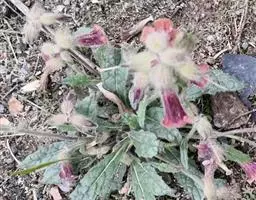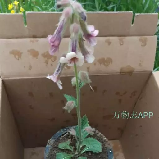 花具长0.5-3厘米之梗,梗细弱,弯曲而后上升,在茎顶部略排列成总状花序,或几乎全部单生叶腋而分散在茎上;花萼钟状,萼长1-1.5厘米,密被多细胞长柔毛和白色长毛,具10条隆起的脉;萼齿5枚,矩圆状披针形或卵状披针形抑或多少三角形,长0.5-0.6厘米,宽0.2-0.3厘米,稀前方2枚各又开裂而使萼齿总数达7枚之多;花冠长3-4.5厘米;花冠筒状而弯曲,外面紫红色,(另有变种,花为黄色,叶面背面为绿色)被多细胞长柔毛;花冠裂片,5枚,先端钝或微凹,内面黄紫色,外面紫红色,两面均被多细胞长柔毛,长5-7毫米,宽4-10毫米;雄蕊4枚;药室矩圆形,长2.5毫米,宽1.5毫米,基部叉开,而使两药室常排成一直线,子房幼时2室,老时因隔膜撕裂而成一室,无毛;花柱顶部扩大成2枚片状柱头。