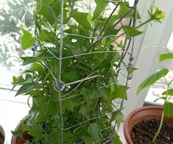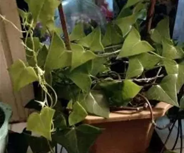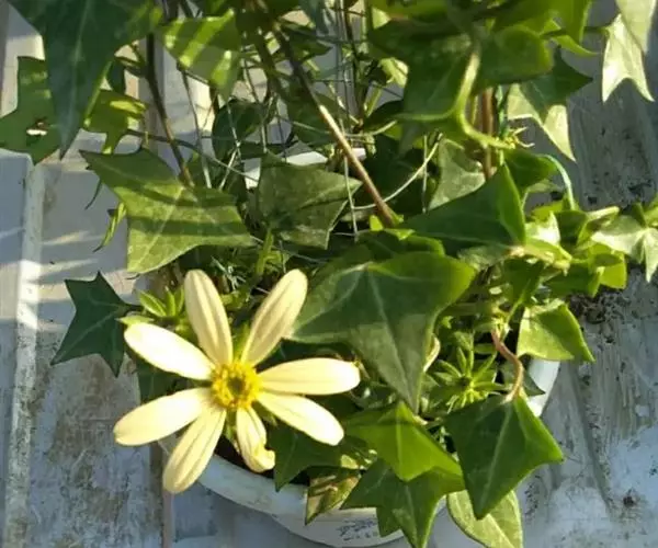 绿玉菊(Senecio macroglossus)为菊科千里光属多年生肉质植物。植株匍匐或悬垂、向上攀援生长,茎圆柱形,红褐色,叶互生,具叶柄,肉质,很脆,易折断,叶色深绿,有浅色的脉纹,小花乳白色,有黄心。绿玉菊原产非洲南部,喜温暖干燥和阳光充足的环境,耐干旱和半阴,怕积水,忌烈日暴晒。绿玉菊枝条婀娜飘逸,叶色翠绿质厚,是优美的室内观叶植物,适合作中小型盆栽摆放于柜顶、桌角,或作吊盆栽种,任其枝叶悬垂生长,具有很好的装饰效果。