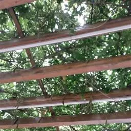 紫藤枝叶繁茂,树体重量很大,因此在定植前要根据园林设计的要求来架设永久性的牢固棚架,在棚架的南侧定植,株距3米左右。如土质疏松肥沃、基肥充足则可促进苗木快速生长,尽早将棚架覆盖。数年后如显得枝叶过密可适度间伐。按常规年年修剪,其花芽多着生在枝条的下部,如果任其自然生长,枝条上部的腋芽萌发后可长出许多徒长枝,将消耗大量营养,使花芽不能正常分化,因而应于每年春季对侧枝进行短截,并疏剪过密枝条及病残枝,促进花芽形成。对新生枝条要人工牵引并将枝蔓均匀绑架,沿架攀缘。花后如不需留种,应随时剪去残花穗。紫藤也可修剪整形呈灌木样,独立栽植庭园草坪、岩石旁。用于盆栽或制作盆景也很相宜。