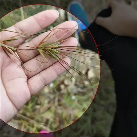 穗形总状花序单生于秆顶,长1.5-3厘米(芒除外),宽约1毫米,细弱而微弯曲,乳黄色;总状花序轴节间与小穗柄均压扁,长为无柄小穗的1/3-2/3,两侧具长短不一的纤毛;无柄小穗长不及2毫米,含1两性花,基盘的毛长约与小穗等长或稍长;第一颖背腹扁平,长约1.5毫米,先端截平,具流苏状纤毛,具不明显或明显的2脉,背面稍粗糙;第二颖与小穗等长,稍长于第一颖,舟形,具1脉而呈脊,沿脊粗糙,先端2裂,裂缘有纤毛,脉延伸成弯曲的芒,芒金黄色,长15-18毫米,粗糙;第一小花完全退化或仅存一外稃;第二小花外稃稍短于第一颖,先端2裂,裂片为稃体长的1/3,裂齿间伸出细弱而弯曲的芒,芒长18-24毫米,稍糙;内稃宽卵形,短于外稃,具2脉;雄蕊1枚,花药细小,长约1毫米;花柱自基部分离为2枚;柱头帚刷状,长约1毫米。颖果卵状长圆形,长约0.8毫米。有柄小穗与无柄小穗同形同性,但较小。花果期5-9月。
