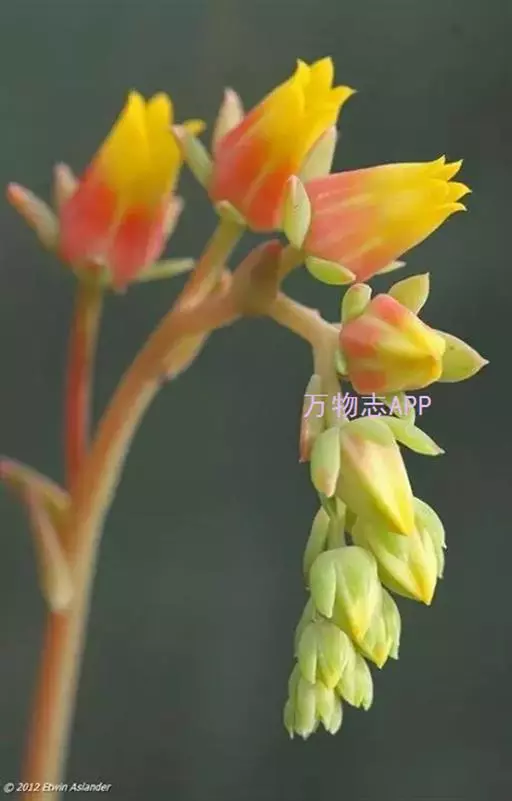 总状花序弯曲呈蝎尾状,单歧聚伞花序腋生;小花钟形,先端5裂,赭红色,顶端黄色。蓇葖果。花期6~8月。