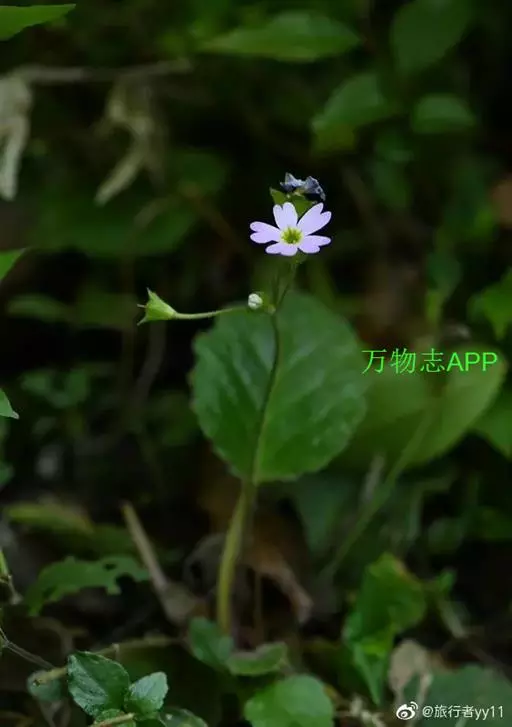 鄂报春(学名:Primula obconica Hance):报春花科,报春花属多年生草本植物,根状茎粗短,叶卵圆形、椭圆形或矩圆形,上面近于无毛或被毛,毛极短,下面沿叶脉被多细胞柔毛,花葶1至多枚自叶丛中抽出,伞形花序2-13花,苞片线形至线状披针形,花萼杯状或阔钟状,裂片倒卵形,花异型或同型,雄蕊着生于冠筒中上部,蒴果球形,直径约3.5毫米。3-6月开花。